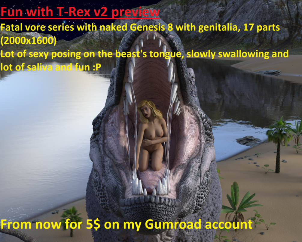 New soft vore T-Rex series with Genesis 8 female with genitalia, 17 parts, lot of different angles and one big burp at the end.