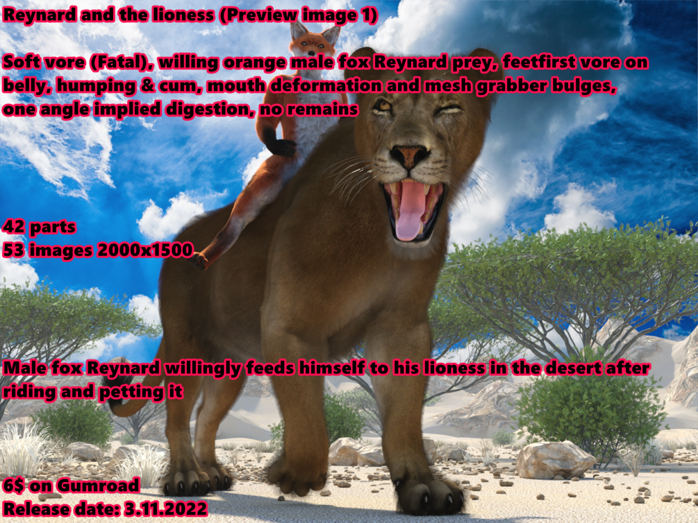 Reynard and the Lioness$6+$6+https://schema.org/InStockusdWerewolfCZWerewolfCZLioness vore commission released on 3.11.2022This product is not currently for sale.Name a fair price:$Size270 MBAdd to wishlist New wishlistShareShare on XShare on Facebook Copy linkCopy product URL