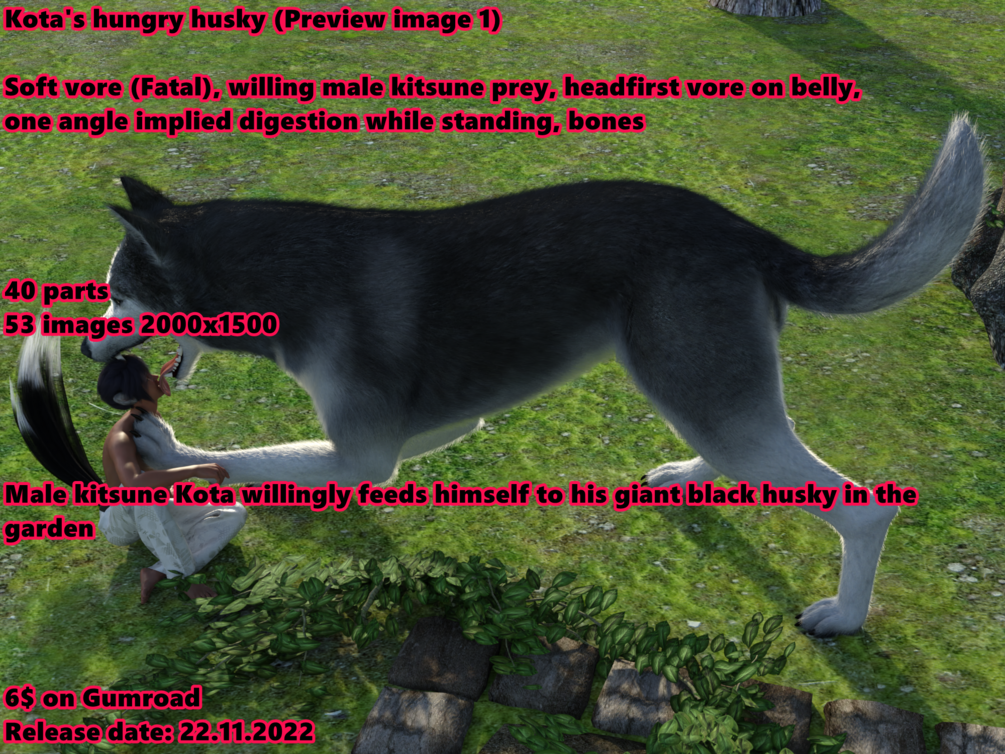 Kota's hungry husky$6+$6+https://schema.org/InStockusdWerewolfCZWerewolfCZHusky vore commission released on 22.11.2022This product is not currently for sale.Name a fair price:$Size263 MBAdd to wishlist New wishlistShareShare on XShare on Facebook Copy linkCopy product URL